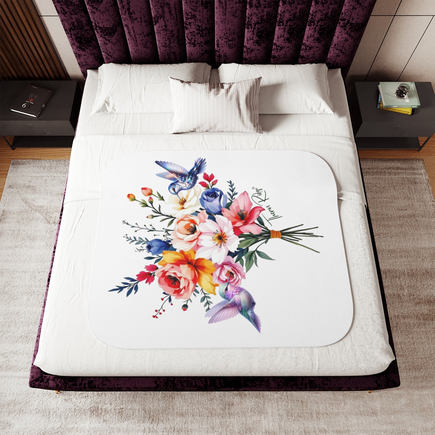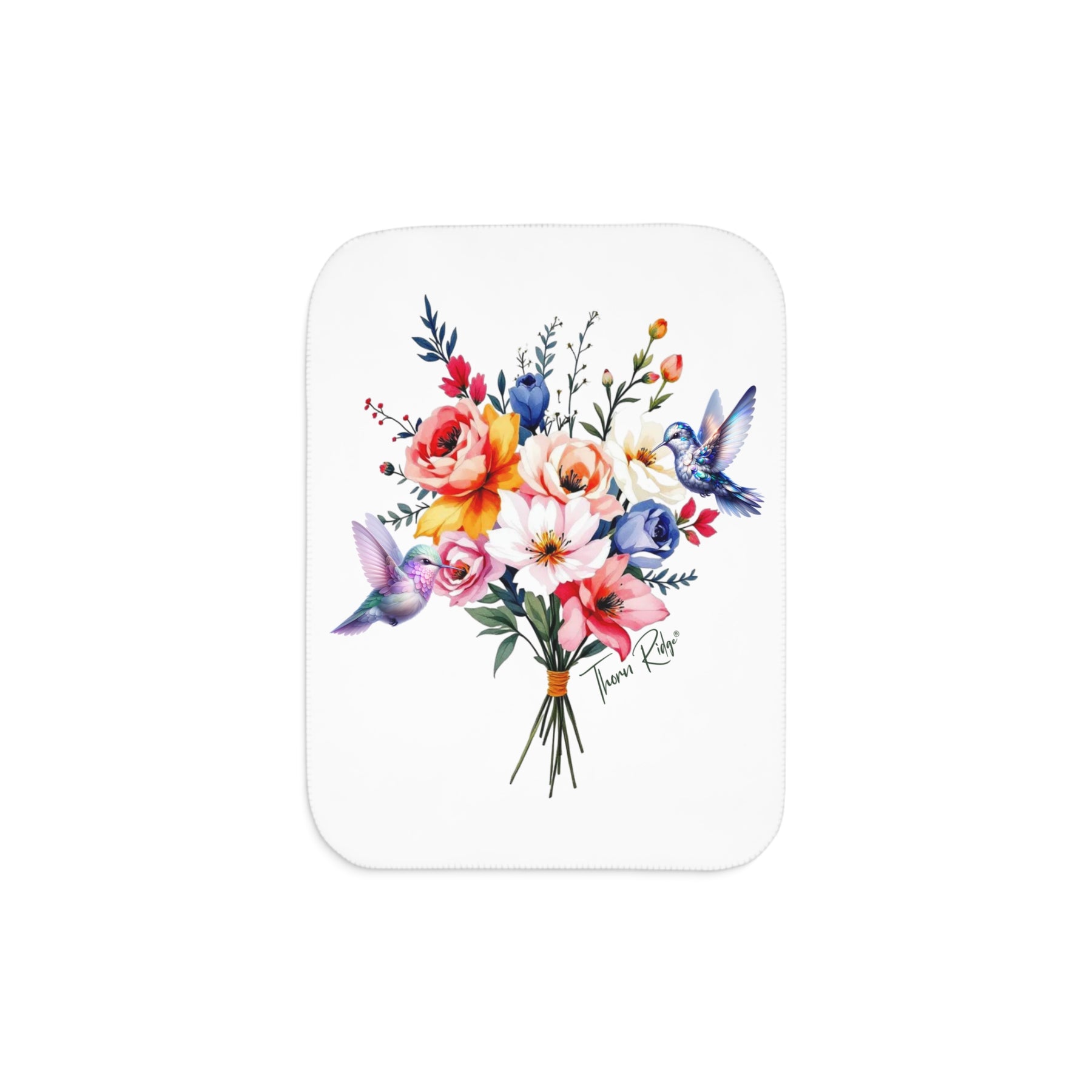 Colorful floral arrangement with hummingbirds on a white sherpa blanket branded Thorn Ridge®