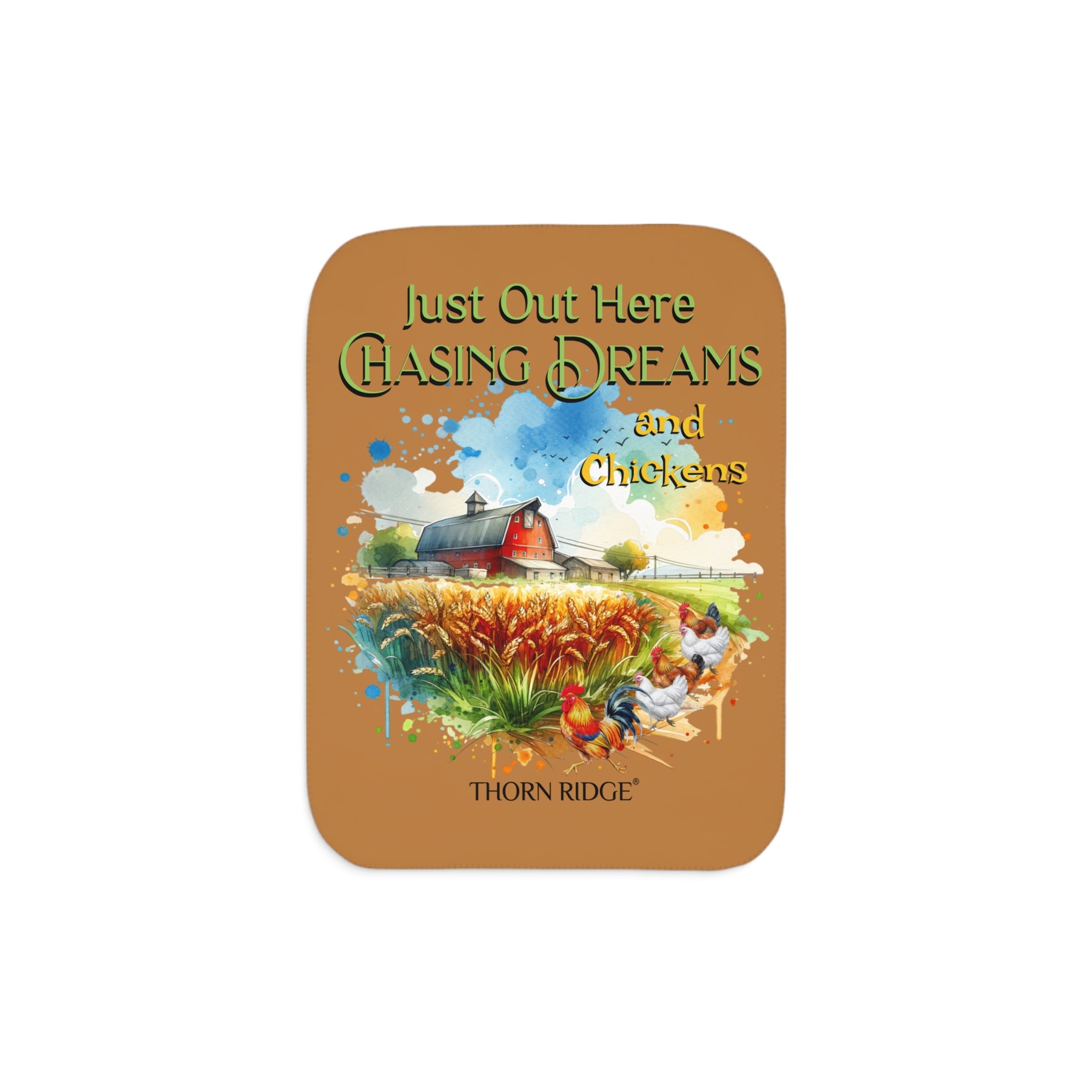 Just out here chasing dreams and chickens by Thorn Ridge® sherpa blanket. Image of a barn, wheat field and chickens running down a dirt road.