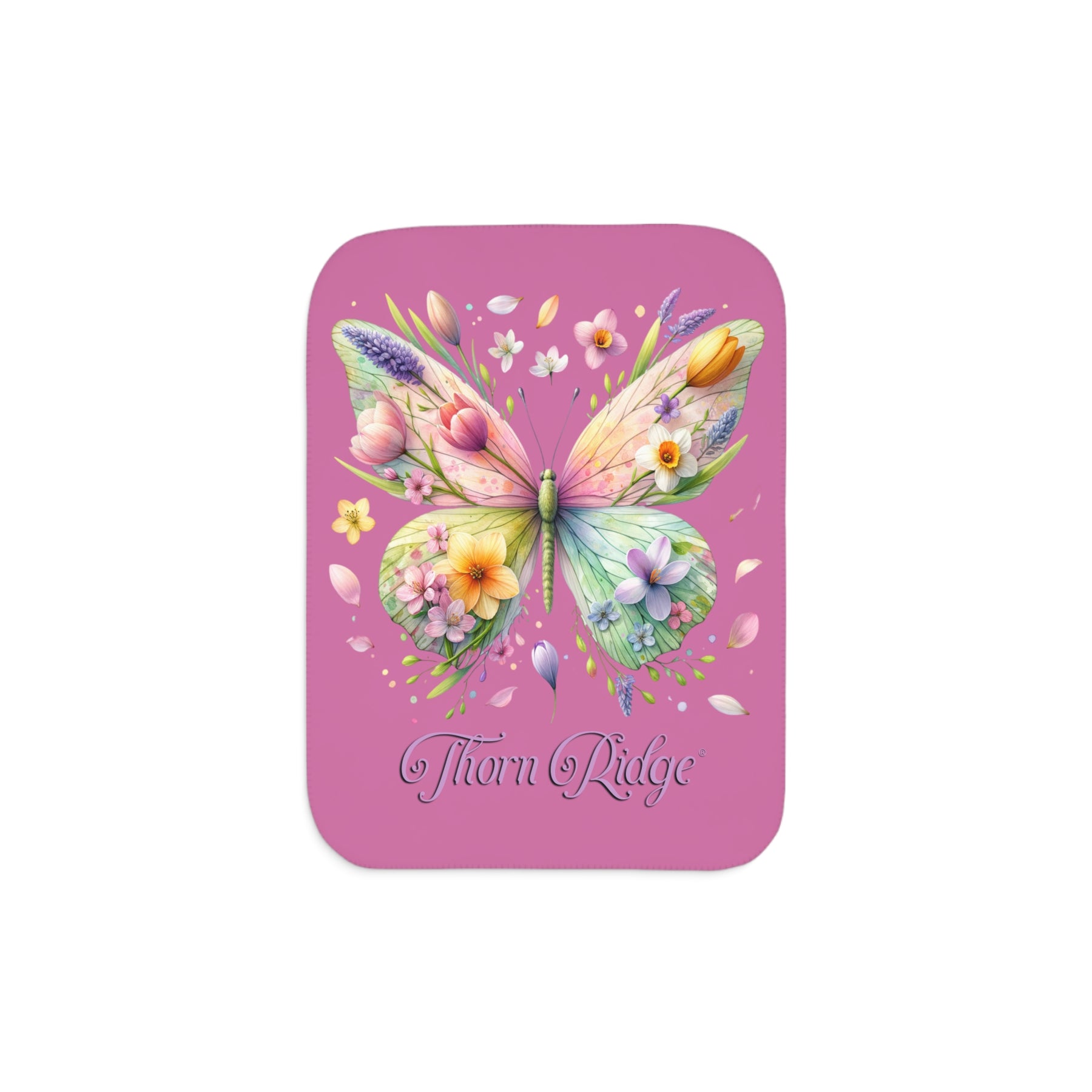 Butterfly design with flowers on a pink Sherpa blanket branded Thorn Ridge
