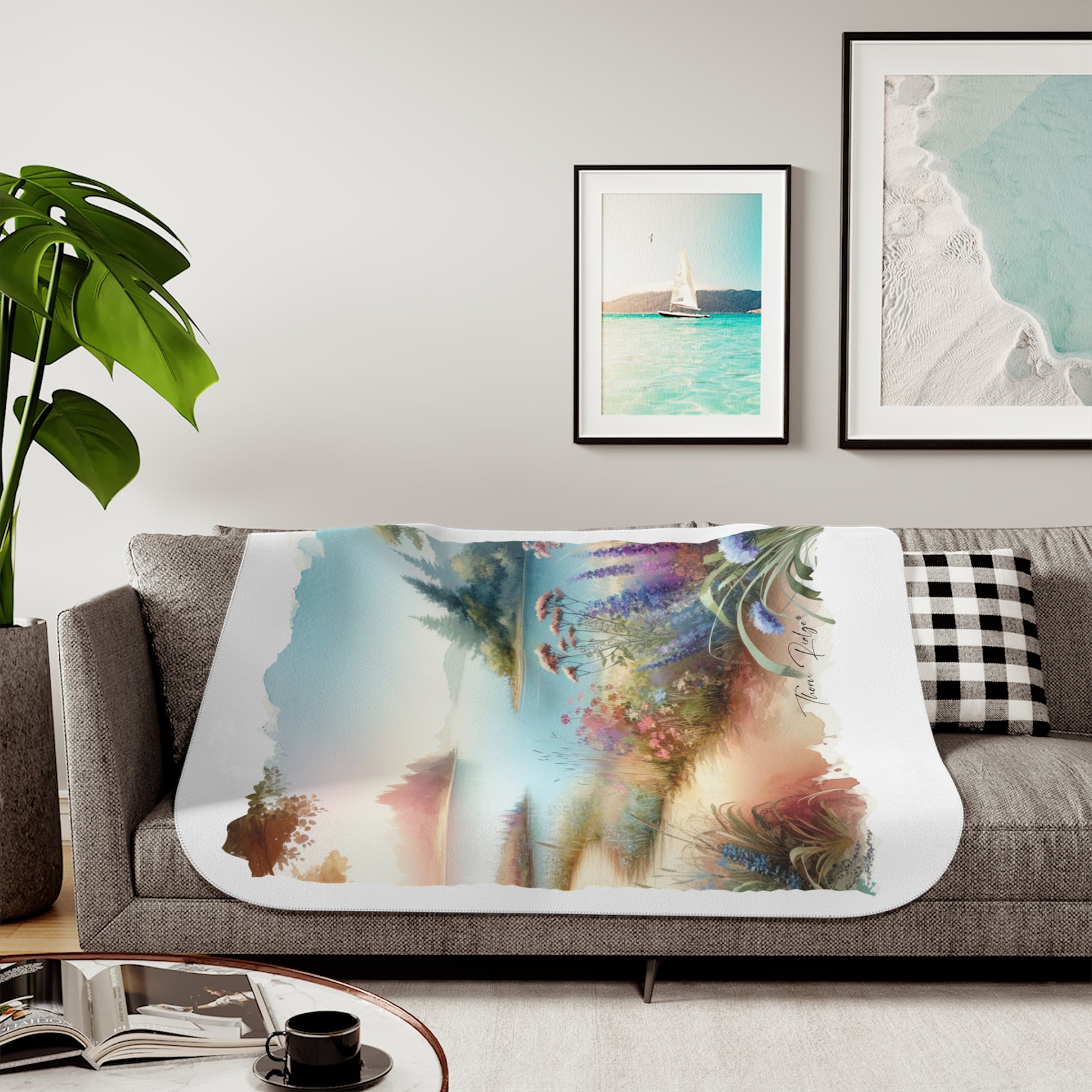 This sherpa blanket carries that feeling of stillness and reflection, inspired by the soft watercolor tones of water meeting sky. It’s a reminder of how nature speaks in silence, how peace doesn’t shout, and how even a quiet moment by the lake can change the way you see the world.