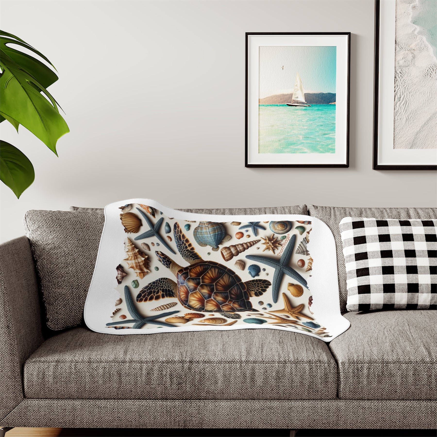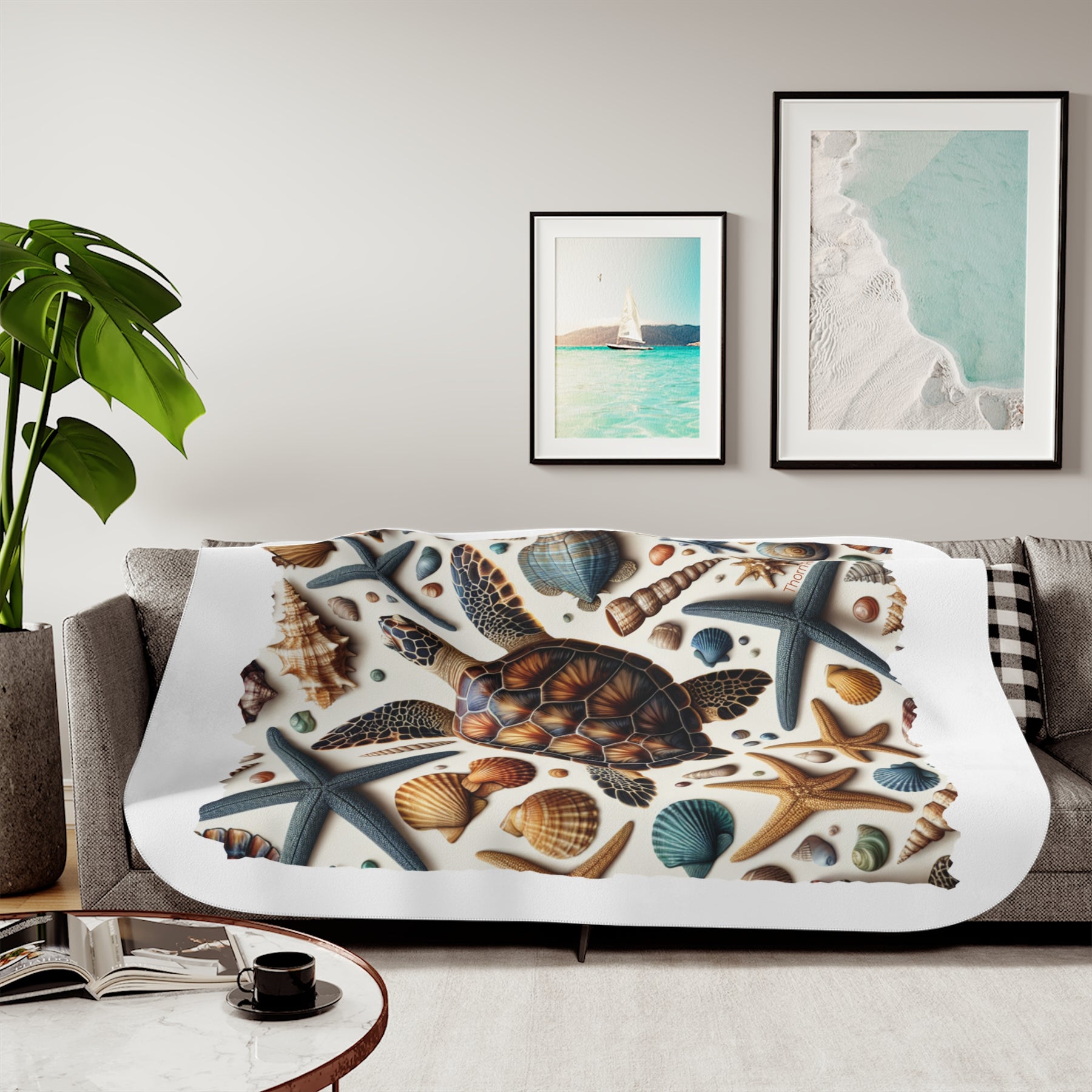 The design captures that wonder, featuring a sea turtle surrounded by starfish and ocean life, just like the shells and treasures that wash up along Florida’s beaches. Soft, warm, and full of coastal charm, this sherpa blanket brings a bit of the shoreline indoors.